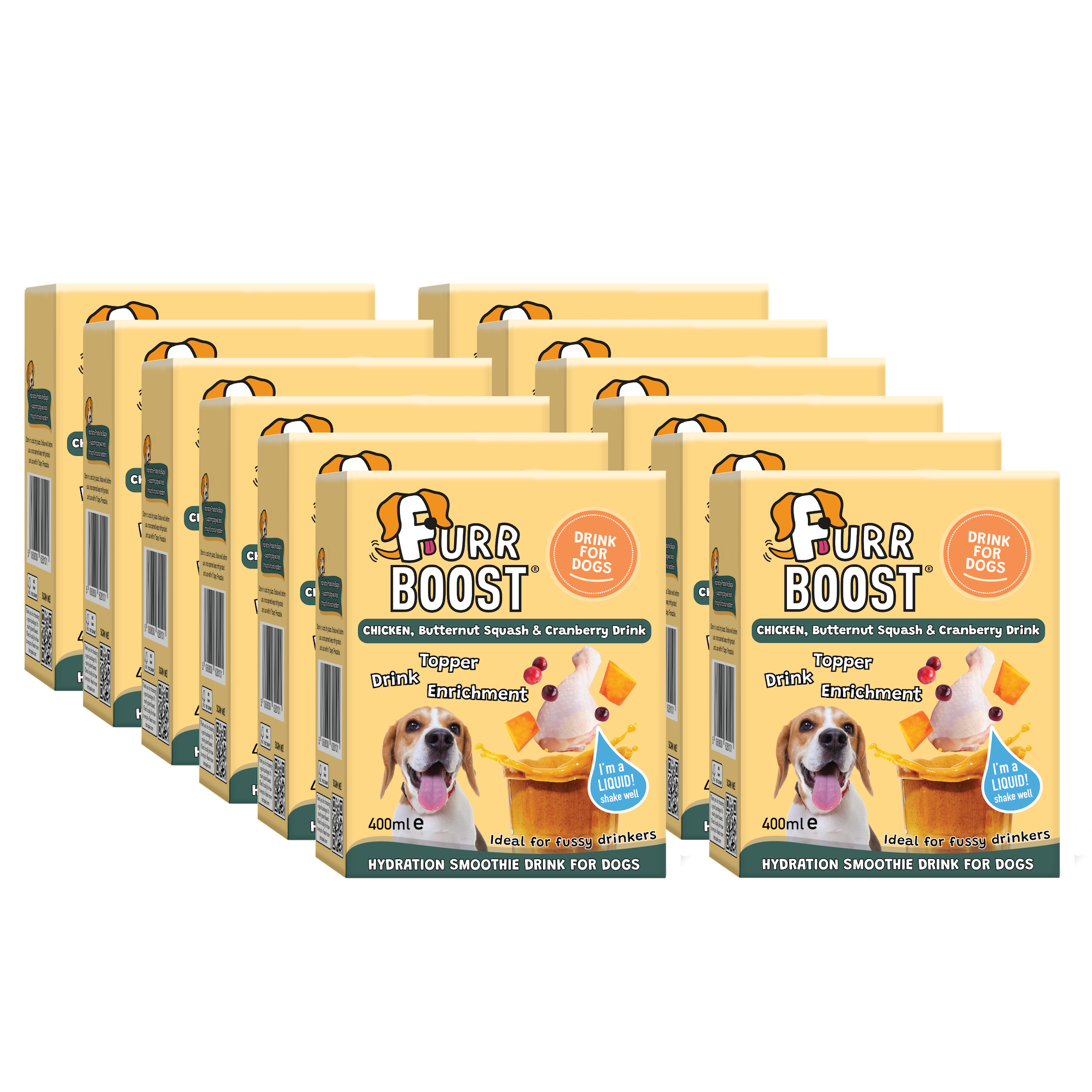Composition: Water, Chicken (10%), Butternut Squash (8%), Cranberries (4%), Flaxseed Oil, Coconut Oil, Salmon Oil, Dried Sea Kelp, Chicory root extract (as a source of the prebiotics FOS and Inulin, 0.36%), Yeast products (as a source of beta glucans, 0.004%):