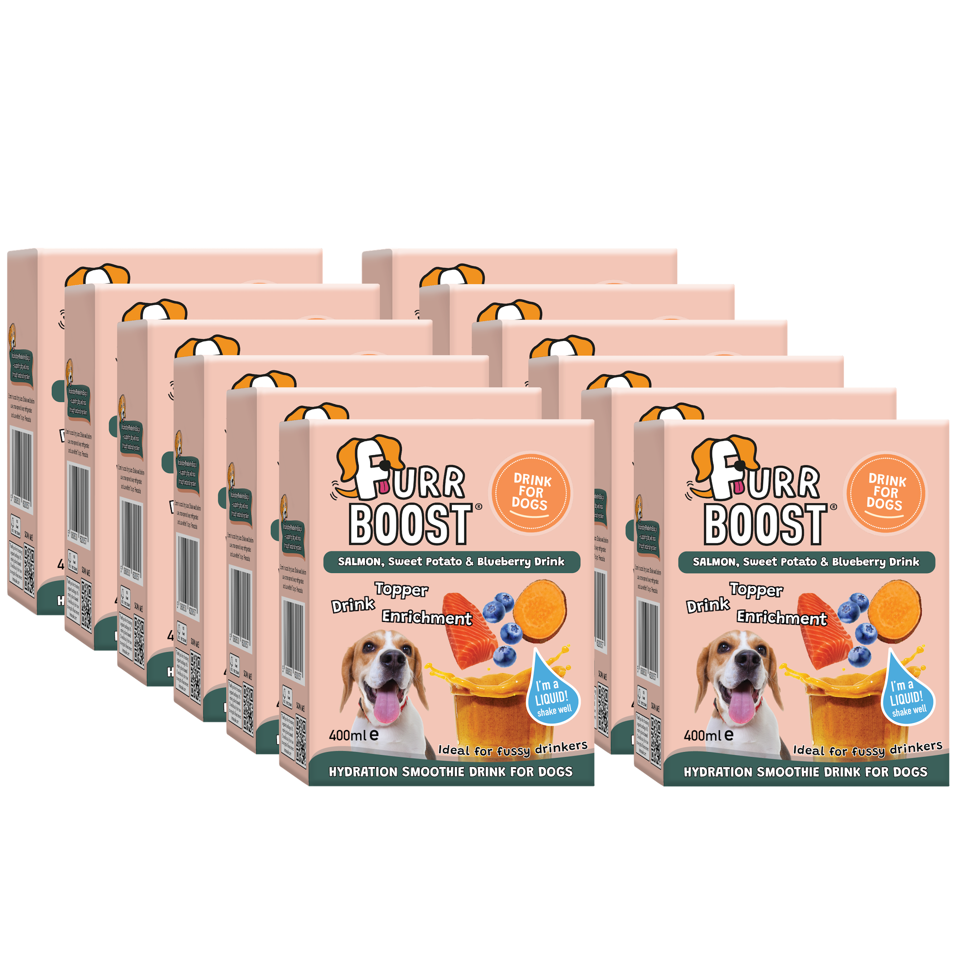 Composition: Water, Salmon (10%). Sweet Potato (8%), Blueberries (4%). Flaxseed Oil, Coconut Oil, Salmon Oil, Dried Sea Kelp, Chicory Root Extract (as a source of the prebiotics FOS and Inulin, 0.36%). Yeast products (as a source of beta qlucans, 0.004%).